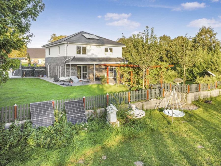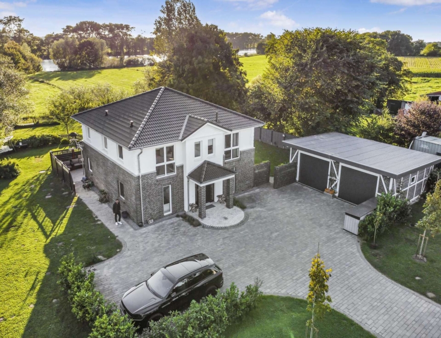 Ein wahres Juwel erwartet Sie an der malerischen Eider! Diese einzigartige Immobilie bietet nicht nur einen modernen Wohnstil, sondern auch eine idyllische Lage, die den nordischen Charme perfekt einfängt. Das großzügige Einfamilienhaus wurde 2019 in Massivbauweise errichtet und überzeugt mit hochwertiger Ausstattung sowie einem durchdachten Grundriss. Der offene Wohn-/Essbereich mit integrierter Küche lädt zu geselligen Stunden ein, während bodentiefe Fenster für eine lichtdurchflutete Atmosphäre sorgen. Zwei Terrassen und eine Pergola bieten zudem herrliche Rückzugsorte im Grünen. Im Obergeschoss erwartet Sie ein luxuriöses Master-Schlafzimmer mit Blick auf die Eider sowie zwei weitere vielseitig nutzbare Räume. Das große und schön angelegte Grundstück von knapp 4.050 m² bietet genügend Platz für Gartenliebhaber und Tierfreunde gleichermaßen. Hier können Sie Ihre individuellen Wohnträume verwirklichen und das Leben in vollen Zügen genießen.