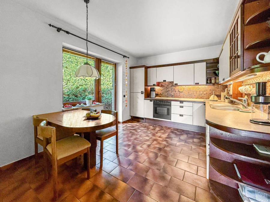 Die gepflegte Küche mit massiven Einbaumöbeln ist hell, freundlich und funktional. Mit Essplatz und direktem Gartenzugang bietet sie alles, was das Herz begehrt – und wer den Retro-Charme liebt, wird sie sofort ins Herz schließen. Ergänzt wird das Erdgeschoss durch ein modernes Gäste-WC mit Dusche sowie ein vielseitig nutzbares Zimmer, ideal als Büro oder Gästezimmer.
